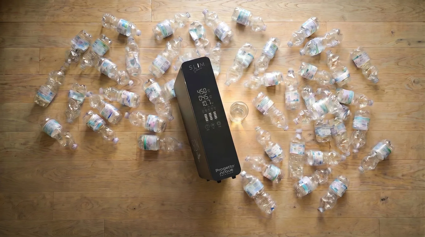 Ogni famiglia consuma centinaia di bottiglie d'acqua all'anno. SLIM Silence ti libera dalle casse pesanti e dalla plastica monouso: acqua pura direttamente dal rubinetto, in comodato d'uso a 29,90 al mese.